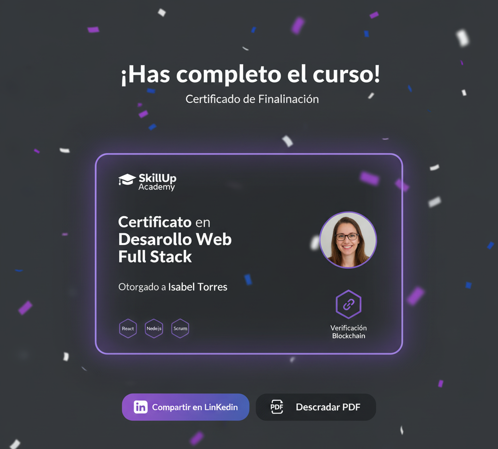 Dashboard con métricas de completitud, tiempo invertido, skills